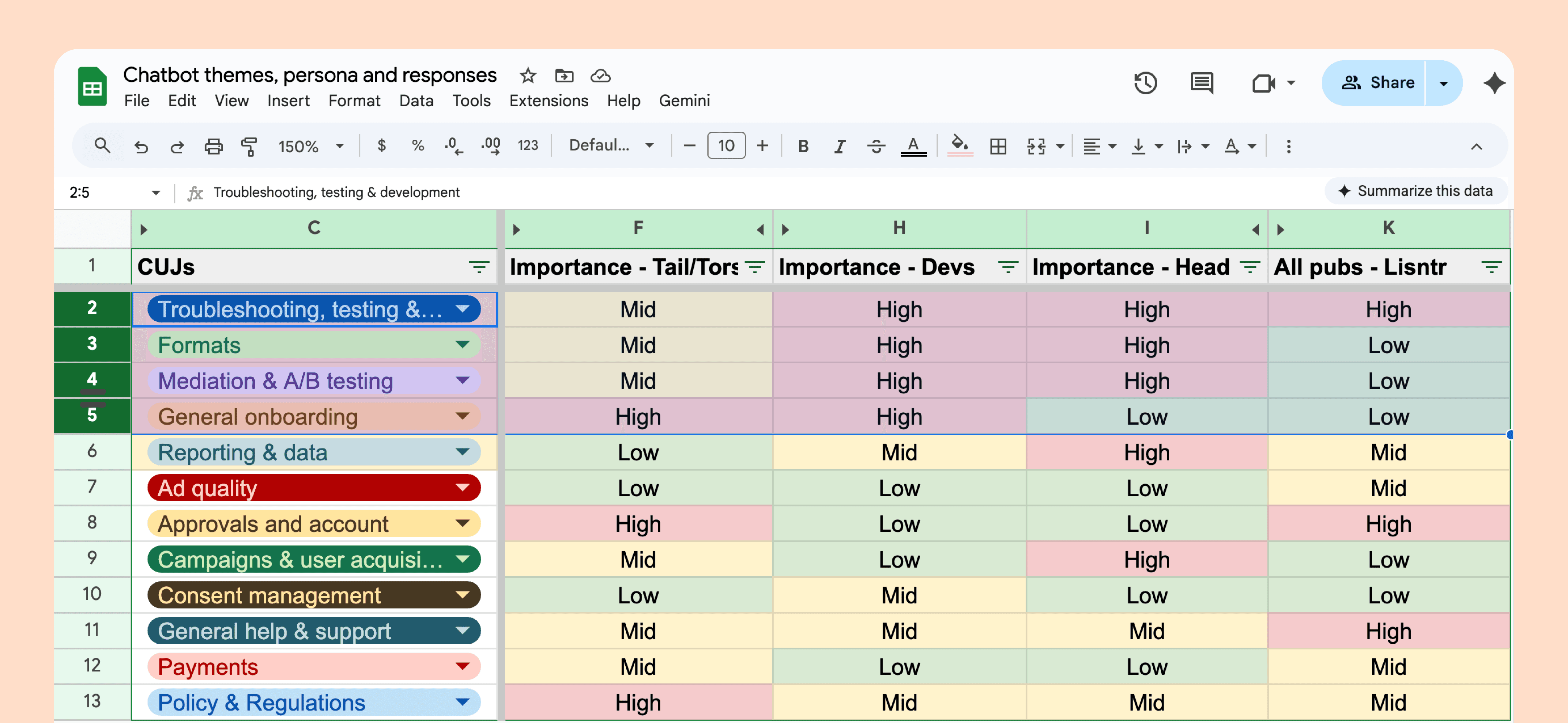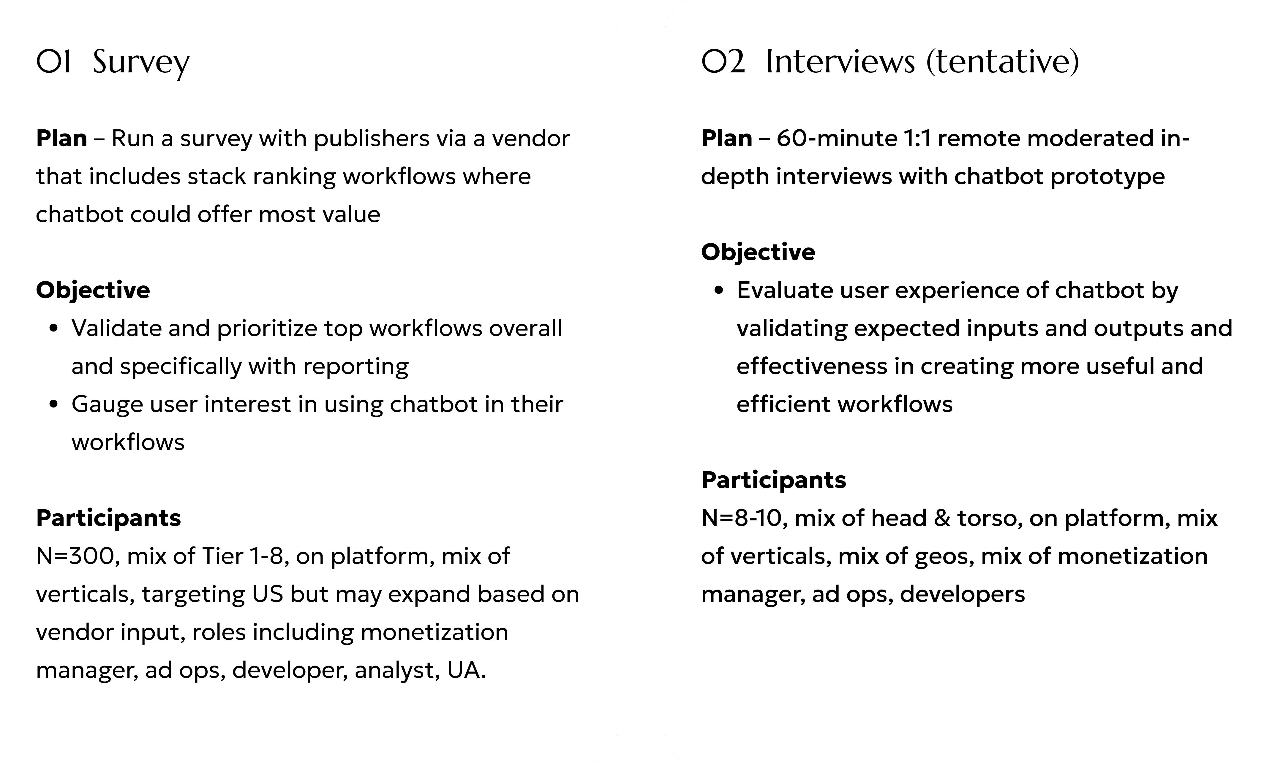 The team needs to validate these use cases so I led the research discussions and wrote the initial survey research plan for 300+ publishers, aimed at strategically aligning their current workflow priorities with the potential application and demand for chatbot assistance.