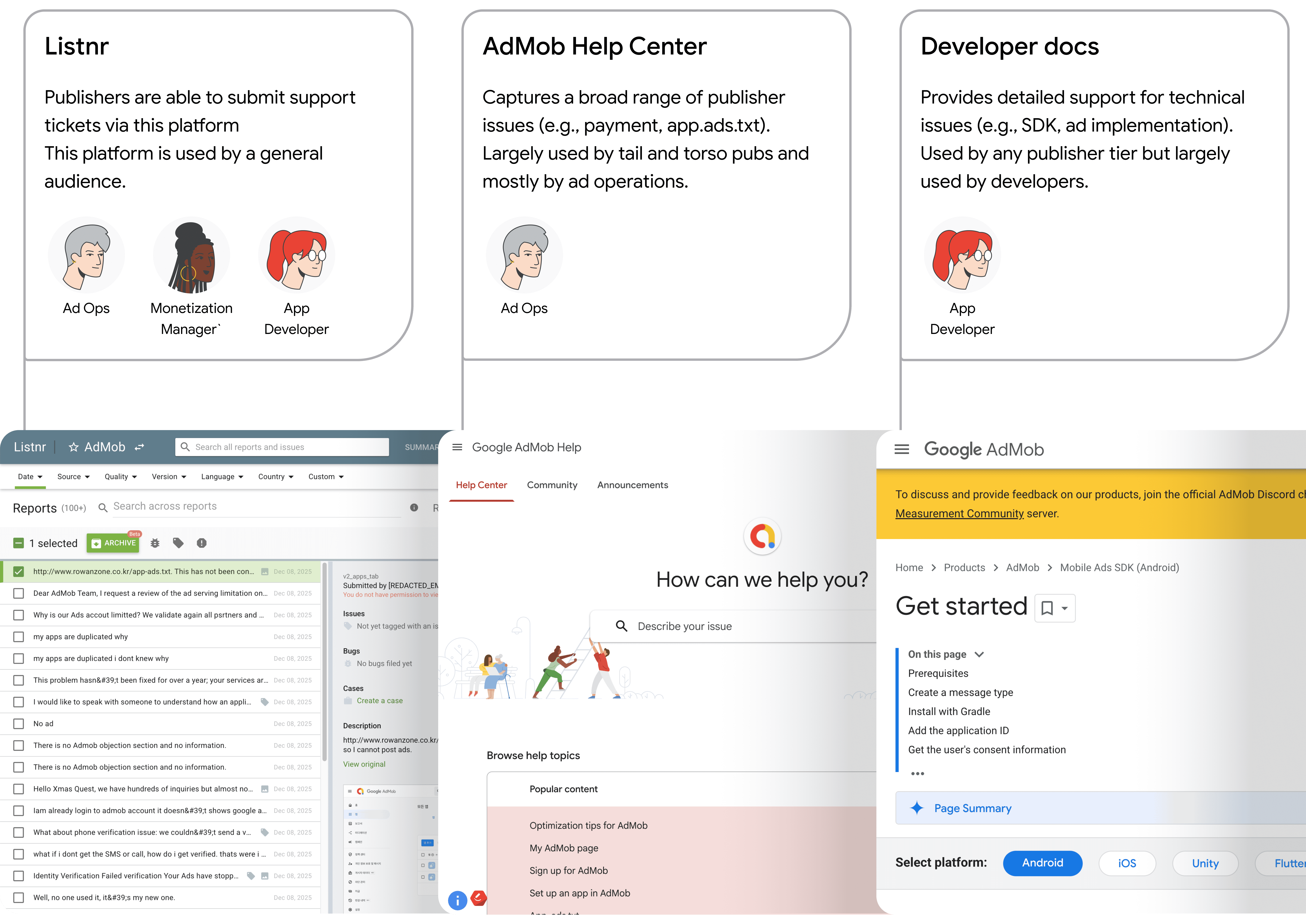 To understand which publisher needs can be helped by a chatbot, I began looking at which data sources publishers currently use to help solve their issues. I landed on the following: